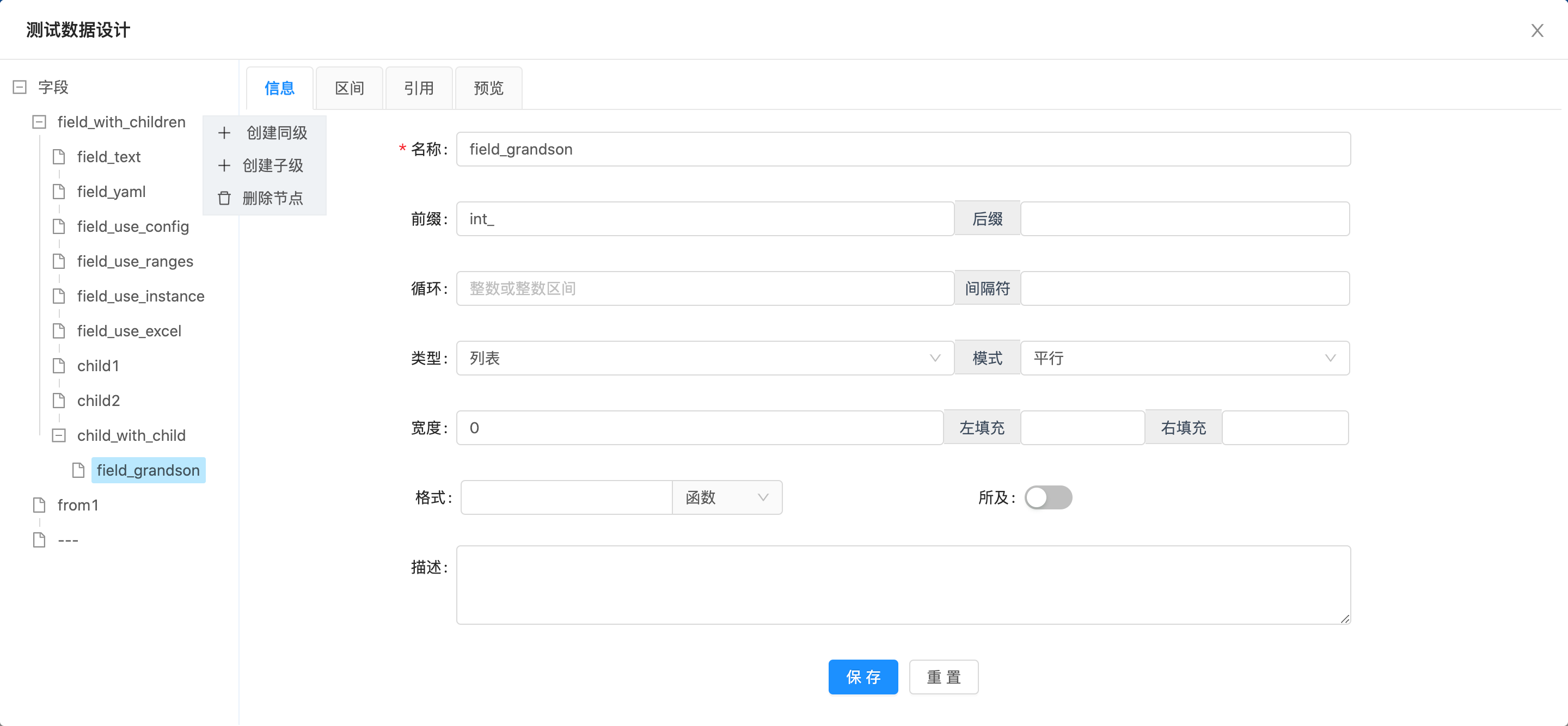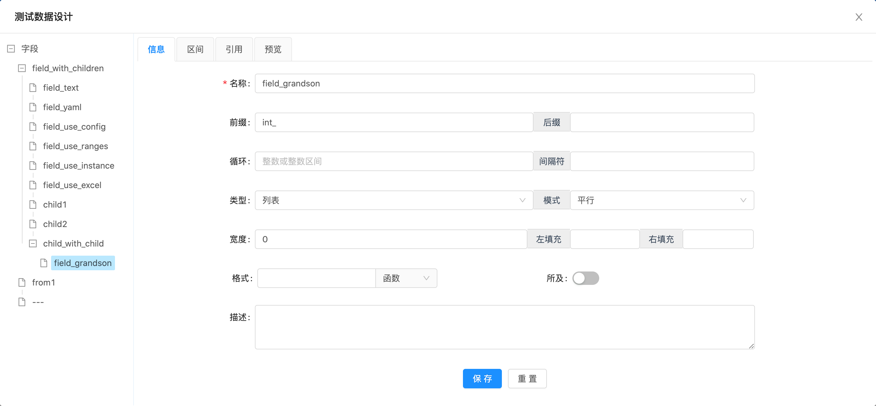 - 页面左侧为树状结构的字段列表,右侧为信息、区间、引用的编辑,以及字段的预览页面;