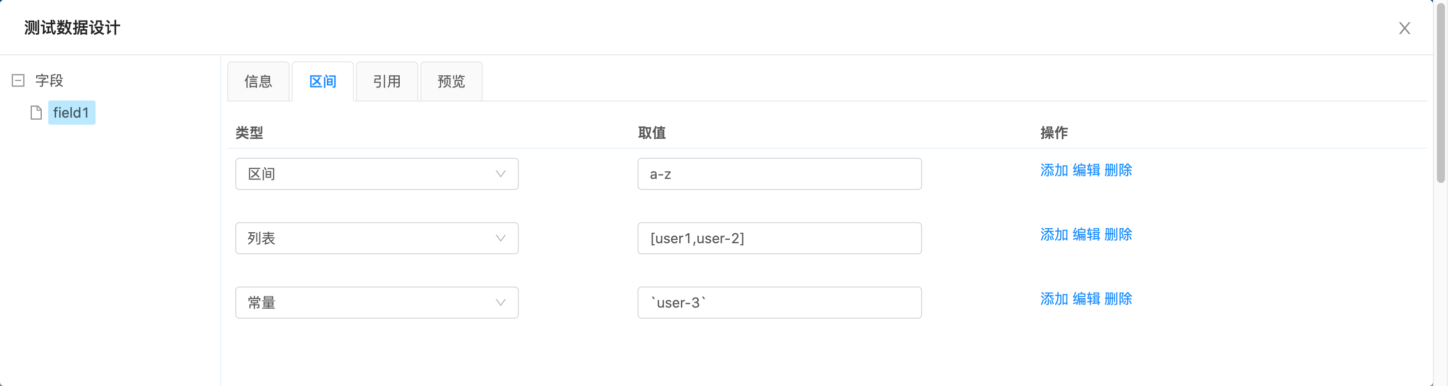 - 针对范围、列表和常量类型,系统将根据用户输入,分别生成类似 a-z 、 [user1,user-2] 和 `user-3`形式的描述符。