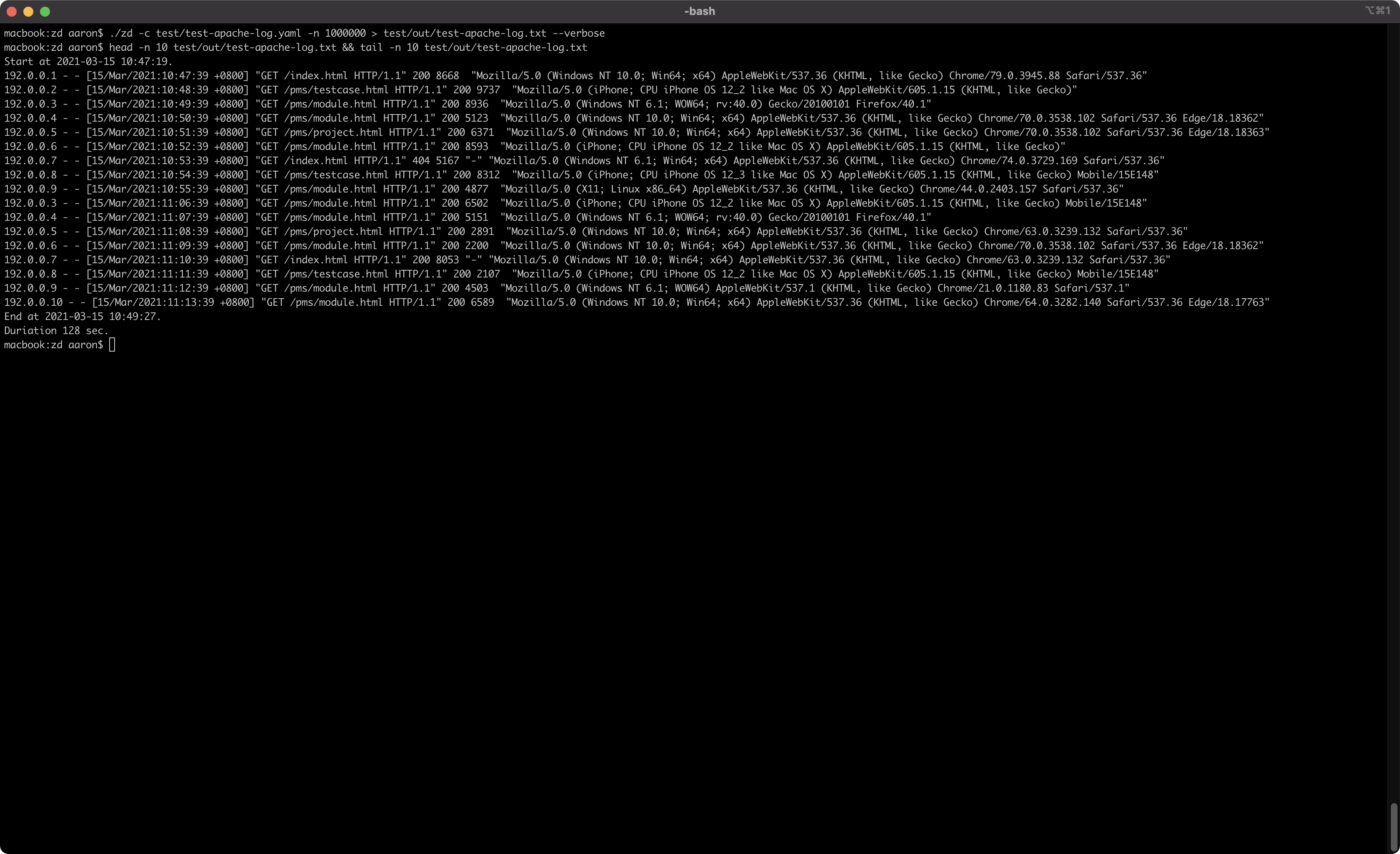 ZenData1.8版本发布,优化了多处数据定义语法和命令行指令,使用yaml/log/apache.access.v1.yaml文件生成的Apache访问日志100万条仅需89秒。
